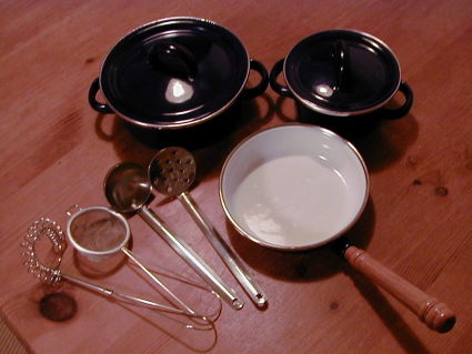 この写真でわかりにくいですが、かわいい紺色のままごとの鍋セットとキッチンツールです。 イギリスの友達にわざわざ送ってもらったのです