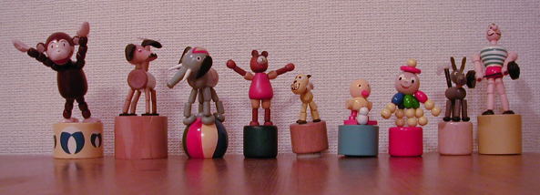 こういう人形ってなんて言う名前なんでしょう 底を押すとぴこぴこっといろんな動きをするので、私は勝手にぴこぴこ人形って呼んでますが、何故かこれがとっても好きでいつのまにかこんなに沢山集まりました。一番歴史が古いのは、真中の黄色い犬くんで私が小3のときに、父と百貨店に行った時に買ってもらったのだ!!