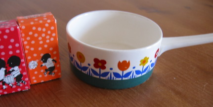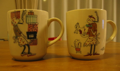 これもむちゃくちゃお気に入りのマグカップです。これも私が幼稚園くらいの時におばあちゃんの家の近くにケーキ屋のタカラブネがオープンして粗品で配ってたという物をもらってきたのです。それ以来ずっと普通に使っていたのですが、ある時これは、すごいかわいい!と思って以来大事に大事に使ってます。もう1種類の絵もあったのに割れてしまったのが かなり残念 きっと配ってたタカラブネもこんなに大事にされてるとは