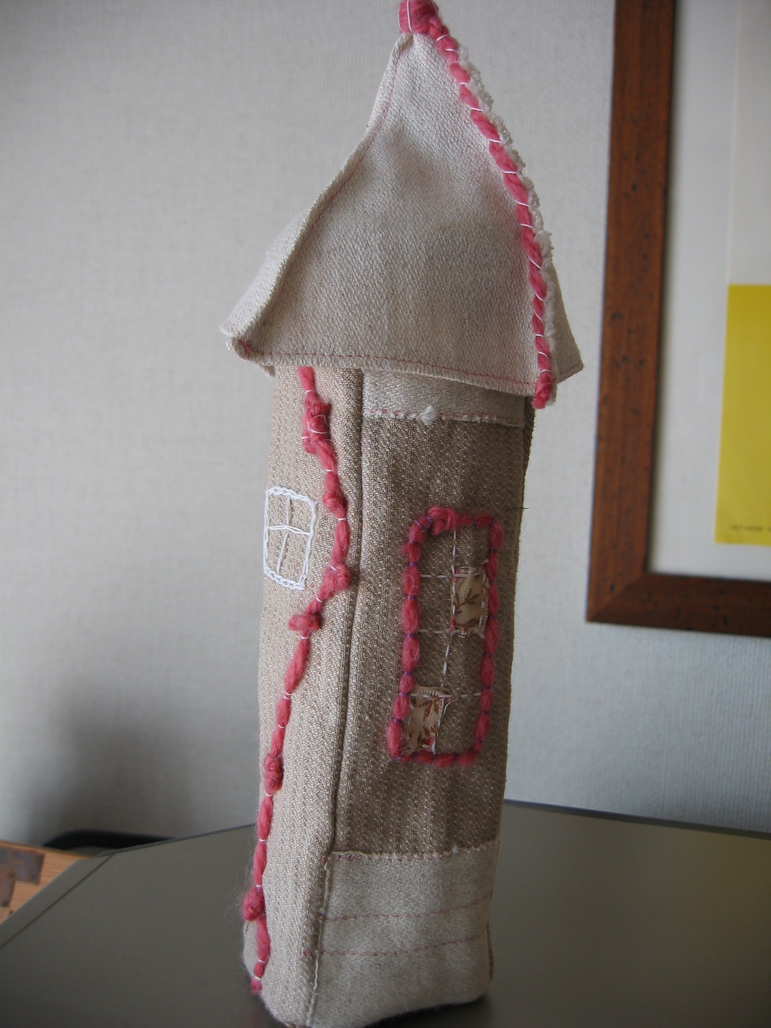 枚方の星が丘のソーイングギャラリーで布で家を作っていらっしゃる方の個展があり 見に行ってきました。たくさんの布で作った家が展示されてて、どの家も屋根がはずれてすごいかわいいのです。そのまま販売もされてたので1件買ってまいりました。ほのぼのしてて素敵ですね