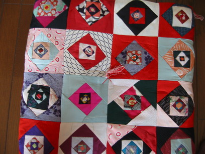 うちの母がお嫁入りする時に近所のおばさんから、着物のはぎれで手縫いで作って頂いた大事なお座布団です。ひとますの中に6種類もの布を使ってあり本当に手のこんだ作業ですばらしい物です。あまりにもすばらしくてもったいなくて使えなかったという物らしいのですが、私が結婚する時に受け継いで持ってきました。私も使えずに 時々出しては、眺めるだけです。もちろん裏もおんなじ様な仕上げで違う布を使ってます。すごいなー