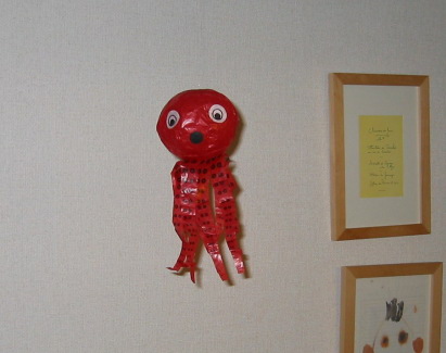 このタコの紙風船 我が家でクーラーの前にぶらさがってゆらゆらゆれて 心を和ませてくれてます。遊びに来てくれた友達が娘にお土産に持ってきてくれました。娘は、赤いタコのものが何故か好きなのです。 とっても喜んで 今も時々椅子の上に立って タコを近くてながめてます。