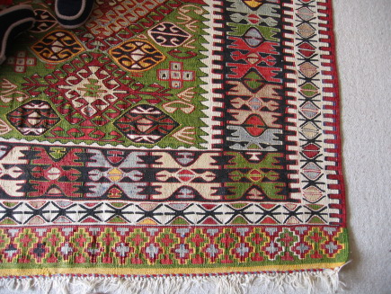 キリムって大好きです。きっと規則正しい柄でもないけれど 手作りで遠い国の人が時間をかけて作ったんだなーってところが好きなんだと思います。結婚前から必ず1枚欲しくて念願のキリムは、大阪の福島区の卸の店でちょっと高かったけども 勇気を出して買いました。 ほつれてきた時は、どうしようかと思ったけども そのお店に連絡したら ささーっと無料で治してくれました。いい物を大事に長く使うってやっぱり ええわー ちなみにこれは、トルコのコンヤ地方のんらしいです。