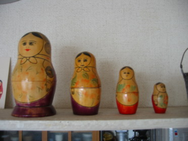 最近マトリョーシカ人形ってよく見かけますね 私には、とっても懐かしい感じのする人形なのです。 中学生の時に確か姉からもらったと思います。 当時は、色も鮮やかだったと思いますが、今は、日に焼けたのか 色は、薄くなってしまってました。でも 愛嬌のある姿のまま健在です。