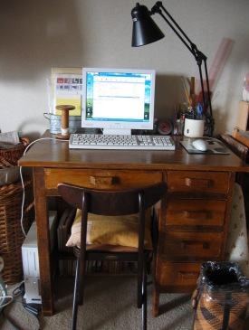 そんなハギレの棚の横は、私の作業机です。 この机も椅子も私よりも遥かに年上です。