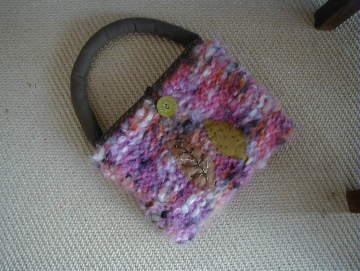 久々の作品!!かわいいフランス製の毛糸でバッグを作りました。見えにくいけど葉っぱのアップリケをつけてみました。でも、使えるのはしばらく先になりそう・・・・冬までお預けです。
