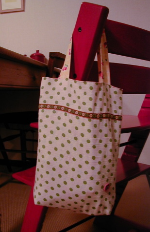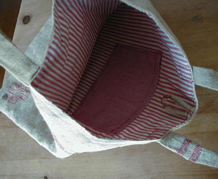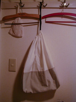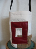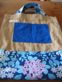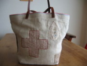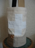 見えにくいですが、お気に入りの素朴な布を選んでパッチワーク風に仕上げました。持ち手は、薄いピンクの花柄です。