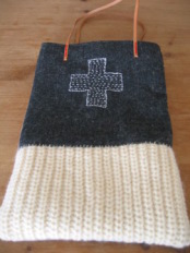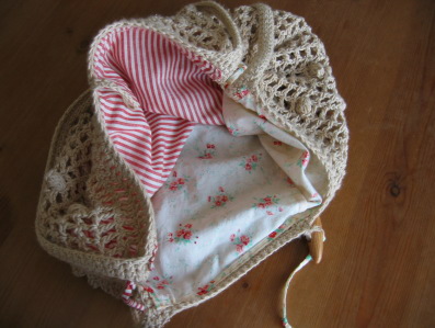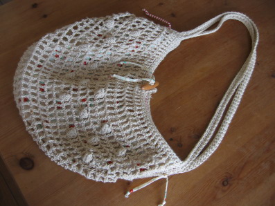これは、ちょっと前に作ったんですがー実は20数年前におばあちゃんにこのタンクトップを編んでもらったのです。当時は、あんまし着なかったけど・・・ずっととってあったけど何かに利用できないかなーって思って裏にデニムを貼ってバンブーの取手をつけてかばんになりました。天国のおばあちゃーんまだ、使ってるよー