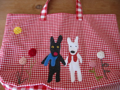 娘は、この4月から幼稚園です。幼稚園には、カバンやお弁当袋やなんやかんやといろいろ作って持っていかないといけない物があります。まずは、絵本のリサとガスパールをアップリケしてカバンを作りました。裏は、パッチワークです。