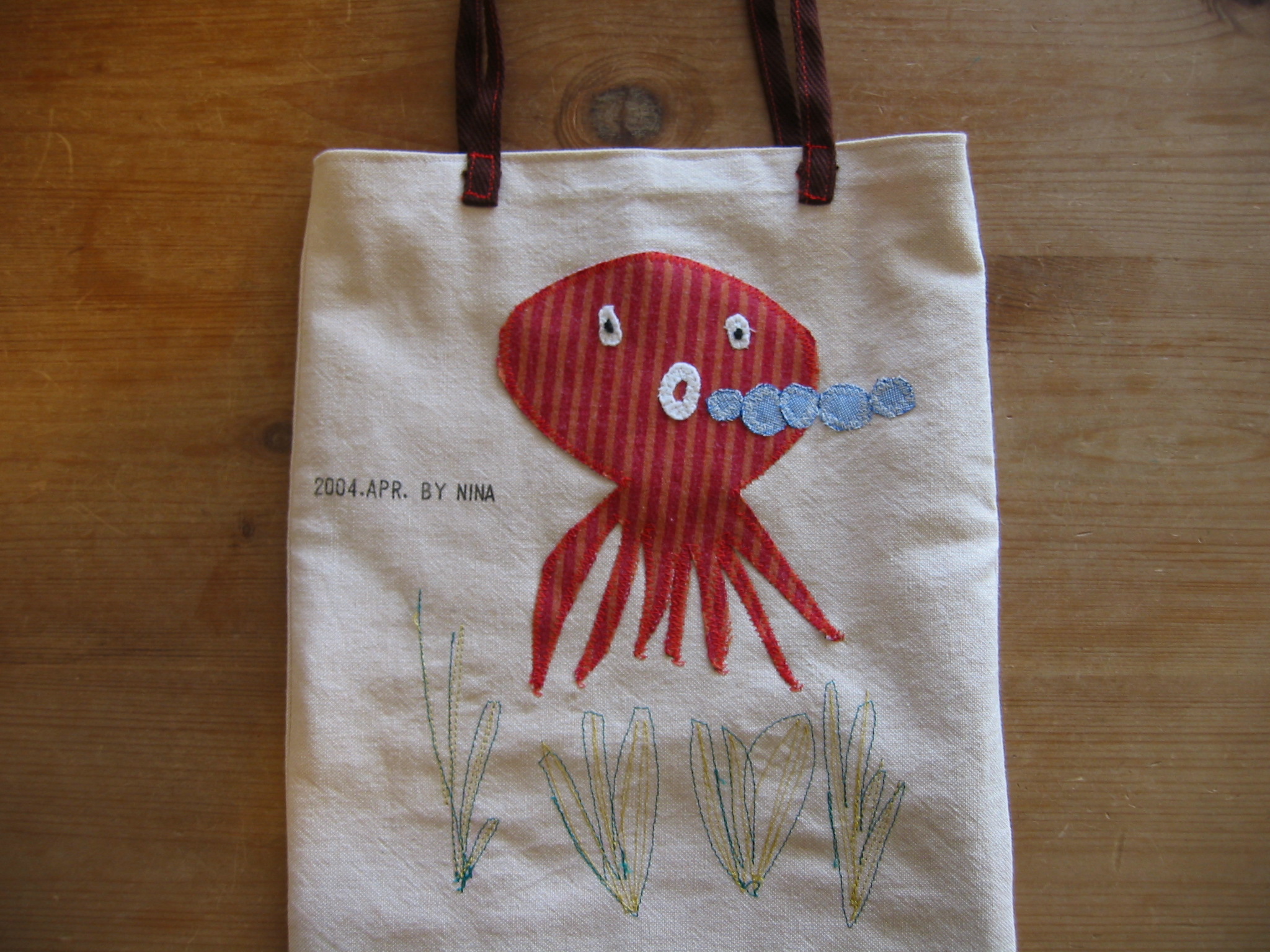 遠いイギリスからはるばる 私と友達と5歳の娘さんNちゃんが日本に3週間帰ってきました。3週間の間に娘は Nちゃんともすっかりお友達になり、Nちゃんは、娘にかわいいタコさんの絵を描いてくれました。これは、きっと娘がいつも持ち歩いてるタコさんなのですね。 そこで Nちゃん母娘がイギリスに帰る時に一緒に日本で遊んだ思い出にでもと思いつき カバンを作ってその絵を写してアップリケにしてプレゼントしました。とっても喜んでもらえてよかったです。