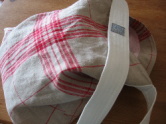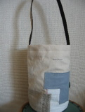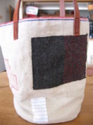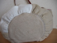 こっちは、やや小さめのバケツ型です。麻の布でまたもや「ぐるぐる」「チクチク」お散歩なんかのサイズにぴったりです。底は、まん丸です。