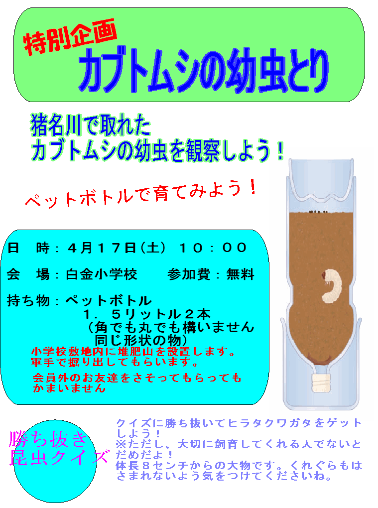 | カブトの幼虫はもれなくプレゼント クイズに勝ち残ってクワガタをゲットしよう! 16年度 |