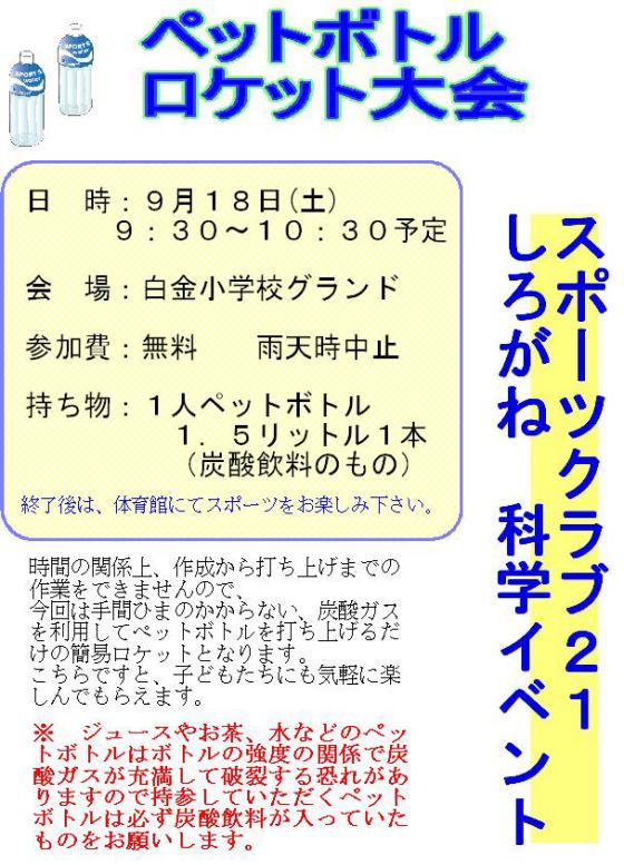 昨年8月30日に設立されたスポーツクラブ21しろがねの会員の資格期間が3月末を持って満了になります。会員のみなさんにはすでに郵送にて継続加入の申込はがきを送付しています。4月以降の活動日は現在と同じく毎月第1.3土曜日の午前中を予定しています。軽スポーツを中心に、囲碁将棋などもできます。新しくパソコンを4台購入しインターネットなどにもふれあってもらえればとパソコンふれあい広場を検討しています。会費は年間大人1500円、中学生以下は500円で保険代等に充てられます。新規申込みは白金小学校内にあるスポーツクラブ21しろがね事務局へ活動日の土曜日にお尋ねください。766−5910まで(活動日以外は不在となります) |