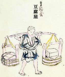 ■長屋の食事を支えた振売り、煮売り屋 振売り(棒手振り)は町の隅々まで入り込み、何でも客の注文に応じた。魚屋は魚を注文通りさばいてくれたし、豆腐屋も豆腐を奴切り(冷や奴)やさいの目切り(味噌汁)にするなど、さまざまに切ってくれた。味噌にキザミネギやいろいろな薬味を入れて丸めた味噌玉というのもあった。また、竈(かまど)の炭や米は少量でも、その日の稼ぎの範囲で買えた。 おでん屋の振売りは、おでん鍋と燗鍋を乗せた木箱に天秤棒を渡し「おでん燗酒」の行灯や暖簾をかけ、呼び声「おでん燗酒、甘いと辛い、あんばいよしよし」と売り歩いた。また、外に出ると二八蕎麦、握り寿司、いなり寿司、天ぷらなどの「屋台」が辻々に出ており気ままな外食も楽しんだ。 また、 「煮売り屋」「煮しめ屋」からは、調理済みの茄子の田楽や蛤の煮物など1品、2品程度の惣菜を買ったりして、その日食べる分を上手に求めた。それだけに調理済みの総菜を売る「屋台」や「煮売り屋」はとても重宝だった。 ![]() 『江戸年中風俗之絵(えどねんじゅうふうぞくのえ)』、1840年・天保11年頃の作とされる。 魚売りは日本橋の魚河岸で仕入れた新鮮な魚を桶に入れ、客の注文に合わせて切り分けた。 ![]() 『成島司直職人歌合』安永7年・1778年/成島司直:将軍家の侍講を勤めた江戸後期の奥儒者。 豆腐屋(振売り)、一日三回、決まった時間に売り歩いた。