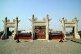 駐車場で観光バスに乗り「天壇公園」へ向かう。観光バスに11人+添乗員1人でがらすきだった。「天壇公園」の入口へ歩いていくと、外国人観光客、中国全土から来た観光客とお土産物を売る物売りでとても混雑していた。中国人の団体客はそろいの赤か黄色のキャップ(帽子)を被っているのですぐわかる(また、同色のチョッキを着ている場合もある)。「天壇公園」は中国の皇帝が五穀豊穣を祈った場所。祈念殿は工事中だった。今回北京は、2008年のオリンピックに向けて名所旧跡・市内と至る所工事中だった。