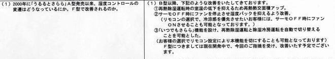 → | ですから、取り説には書いてあります。 再熱交換器の面積UP以外の所では、ユーザーの使い方も判っていない部分があったので、負荷の低いところではさらら除湿モードにして、ご使用くださいと・・・。 |