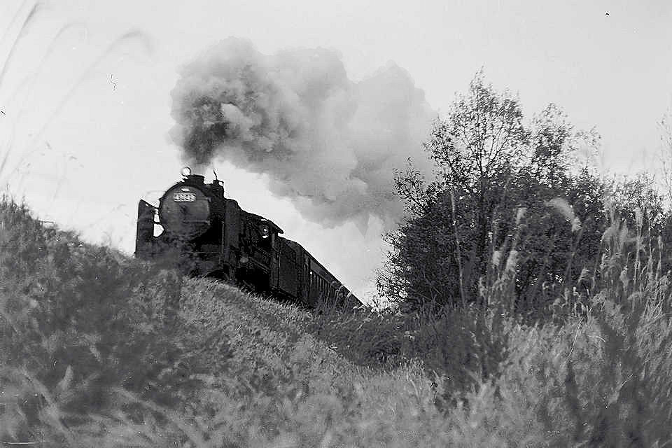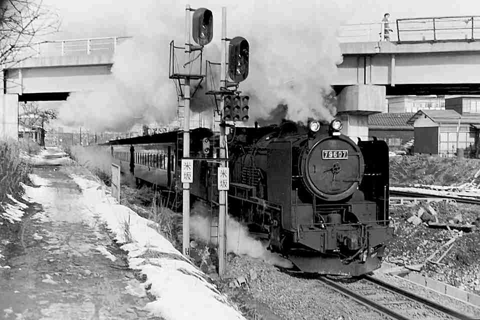 79607 hauling 125 passenger and freight mixed train passes under the overpass of Route 113, spewing white steam, and climbs a gradient of 16.7.