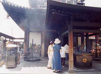 | 納骨堂の前で、線香とろうそくを供える人々。ここには1887(明治20)年に5万人分のお骨仏を造って以来、戦前まで6体の仏像が祀られていたそうだが、戦争によって焼失。戦後、再建され、今にいたっている。もうもうと立ち上る線香の煙が訪れる人の多さを物語っている。お参りに来られている人に混じり、私もお線香をお供えした。 | ||