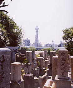 | 納骨堂の脇に広がる墓地。納骨オンリーかと思っていたけれど、小さいながらも立派な存在感を見せる墓地だ。なんと、大阪名物の通天閣があまりにも見事に見える。エッフェル塔を望むパリのパッシー墓地を思い出した(趣はちと違うけど・・・)。中には無縁化というか遺族不明状態になったお墓もちらほら。そういうお墓には寺に申し出る旨のプレートがかかっていた。ちょっと切ない風景だった。 |