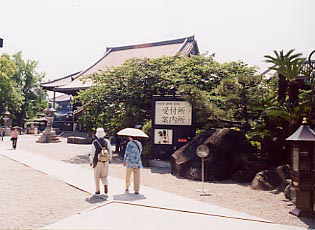 | 大本堂。ここには施餓鬼法要(広辞苑では「飢餓に苦しんで災いをなす鬼衆や無縁の亡者の霊に飲食を施す法会」とある、先祖を供養する法要ということでいいだろうか)を受けている人たち、それを待つ人たちで賑わって(?)いた。ふと見ると、畳の上には白い布に包まれたお骨の箱が無造作に置かれている。施餓鬼を待つ人の顔も、何故清々しく見えた。 | ||