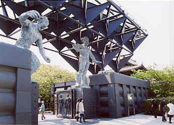 モダンな山門は、平成9年4年に建立されたもの。左側の阿形(あぎょう)像は心の邪念を戒め、右の吽形(うんぎょう)像は世の紊(みだ)れを戒めている。(山門横の案内板より) 山門の存在感には圧倒されたけれど、意外に威圧感はなく、古い建物とも不思議とマッチしている。 |
