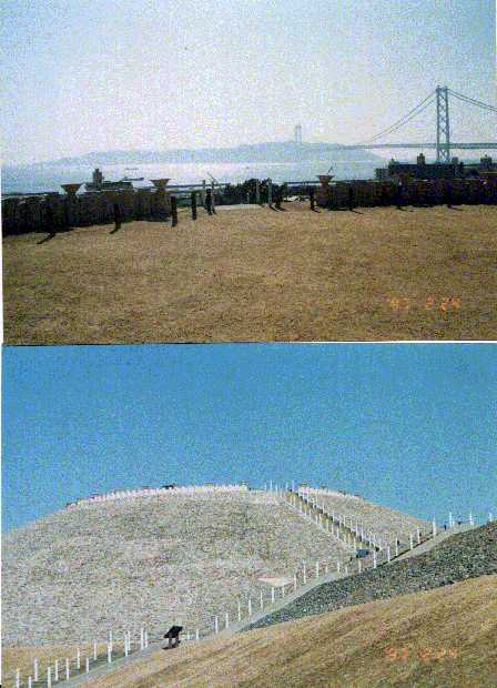 古墳という絶大な権力の見せびらかしの前に、潮の流れを変え、漁業と環境に多大な影響を与えている世界一のつり橋明石海峡大橋が九八年の開通を待っている。