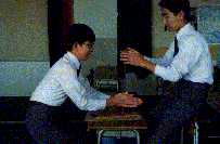 ところがキリモミ式の発火法でも、小学校高学年から中学生の生徒なら1分ほどで簡単に発火させる事ができる。ヒキリ棒が左右に動かないように注意しさえすれば、二人が向かい合わせになって、疲れたら交代する方法をとってもよい。