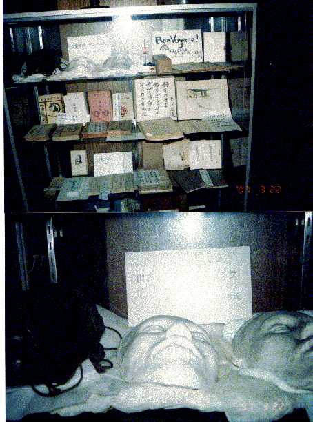 山本宣治の生家の花やしきの土蔵内にある資料室。同志社中学の小田切氏の案内で見せていただいた。 上は「山宣」の愛読書や書が陳列してある。 下は「山宣」のデスマスクである。 山宣は、当時の帝国議会で唯一治安維持法の強化改悪に反対した。それ故1929年3月5日、東京神田で右翼の凶刃に倒れた。 (参照 『平和博物館・戦争資料館ガイドブック』)