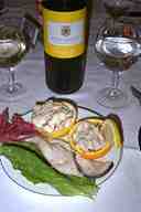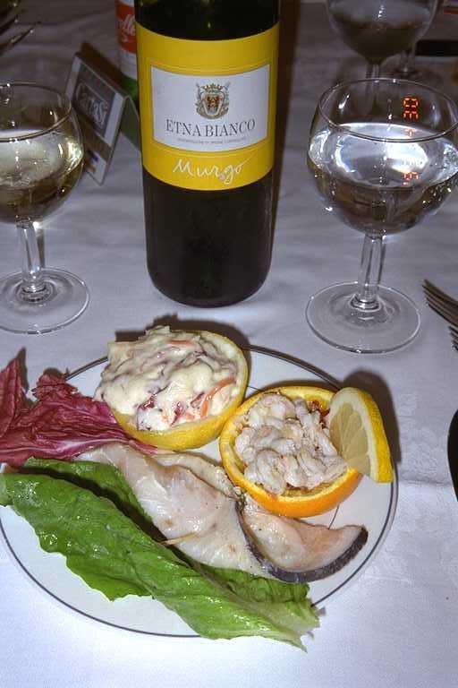 前菜は、半生のカジキマグロとエビのサラダです。ワインは「地球の歩き方」でも紹介されている地元のワイン、ETONA