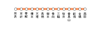 | 奈良 京終 帯解 櫟本 天理 長柄 柳本 巻向 三輪 桜井 香具山 畝傍 金橋 高田 |