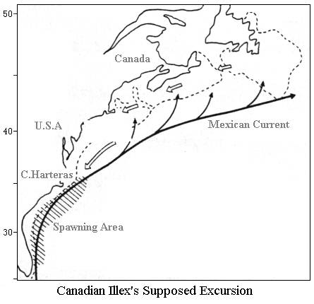 以上からカナダイレックスの回遊は下記の様に想定される。主要な産卵場は、卵が正常に發生するのに必要な摂氏12度以上の水温が存在 するハテラス岬以南の大陸棚上か大陸斜面域で有ろう。産卵盛期は冬で有る。孵化した稚仔の一部は餘り移動し無い儘に米國沖の大陸棚 上で成長する。一方、稚仔の一部はメキシコ灣流に巻き込まれて外洋域に流される。其の後、メキシコ灣流から離れ、幼烏賊と成り大陸棚へ 移動する。夏から秋には米國北部からカナダ沖の大陸棚上で生活する。秋の終わりに成ると成熟し乍ら南下回遊し、産卵後に死亡する。