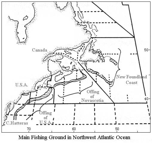 主要漁場は加奈陀のニューファンドランド近海、ノバスコシア沖、及び、米國沖の三箇處に分けられる。此れは主として海底 地形に依る者で、資源はひとつと考えられる。ニューファンドランド近海は主として加奈陀の小型釣船の漁場で有る。但し、沖合の大陸棚縁邊 部にはトロール漁場も形成される。ノバスコシア沖では主としてトロール船が大陸棚の縁邊部で操業して來た。日本の烏賊釣船も一時期操業 したが、漁場はノバスコシア沖の大陸棚の粗全域に形成された。米國沖では主要なトロール漁場は大陸棚の縁邊部に形成される。