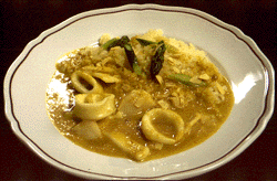 調理方法 玉葱、人參、大蒜、生姜を細かく刻む。 鍋にバターを入れ、玉葱、人參、生姜を焦茶色に成る迄20分間緩っくりと炒める。 材料が褐色に成ると、小麦粉とカレー粉を加え、輕く掻き混ぜ乍ら炒める。ブイヨンを滑らかに溶ける様に少し宛加える。更に、 ココナツミルクを同じ様に、塊に成ら無い様に少し宛加える。其の後、ブーケガルニと牛乳を加え、一旦煮立てた後、30分間 弱火で煮る。 米を研ぎ、水切りを仕て置く。玉葱は細かく刻む。 他の鍋にバターを溶かし、玉葱と米を掻き混ぜ乍ら炒めた後、ブイヨンを加え、加熱する。 帆立貝を各々4箇に切り、烏賊は輪切りに仕て、塩、胡椒を振り掛ける。 オリーブ油を引いたフライパンを熱し、烏賊と帆立貝を素早く掻き混ぜ乍ら炒める。 鍋にヨーグルトを加え、良く混ぜ合わせた後、烏賊と帆立貝を加え、塩、胡椒で味を整える。 グリーンアスパラガスを塩水で茹で、斜め切りにする。 皿にバターライスを盛り、カレーソースを懸ける。薄切りアーモンドとアスパラガスを添え、刻みパセリを振り掛ける。 |