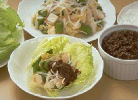 烏賊(いか)100瓦 芝海老(しばえび)200瓦 グリーンアスパラ 1束 缶詰粒玉蜀黍(つぶこーん)カップ半分 モヤシ 100瓦 長葱(ねぎ)半本 調味料A 赤味噌(あかみそ)50瓦 擂卸し林檎(すりおろしりんご)四半分箇分 顆粒鷄骨スープ(とりがらすーぷ)大匙半分 水(みず)大匙3 一般用甘味料(パルスイート)大匙1 胡麻油(ごまあぶら)小匙1 レタス 半箇