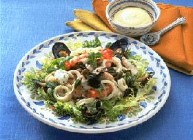 輪切り烏賊(いか)1尾 ムール貝 8箇 海老(えび)8尾 削ぎ切り蛸足(たこあし)1本 調味料A 水(みず)カップ1 白葡萄酒(しろぶどうしゅ)カップ半分 セロリ 3本 薄切り人參(にんじん)20瓦 薄切り玉葱(たまねぎ)四半分箇 薄切り檸檬(れもん)3枚 白胡椒(こしょう)少々 月桂樹の葉(けっけいじゅ)少々 調味料B フレンチドレッシング カップ3分の1 微塵切りパセリ 少々 微塵切りチャービル 少々 薄切り玉葱(たまねぎ)四半分箇 調味料C サッと熱湯に通した若布(わかめ)40瓦 オリーブ 4箇 調味料D エンダイブ 適量 マーシュ 適量