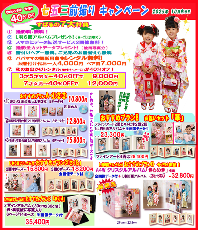 素敵な笑顔を未来に・・ おかげさまで7月に20周年を迎えました。ありがとうございます。 七五三前撮りキャンペーンは10月末まで。12月に後撮りするのもお勧めです。 ★初宮参り,七五三のロケーション撮影 ご予約受付中!(大人気) 何処よりもお得で最高の写真を目指して20年! 当店はお客様の待ち時間ゼロ、完全貸切制です。 各種証明写真もお任せ下さい ![]() オーデション等もお任せ下さい。是非 ご検討下さ。 |