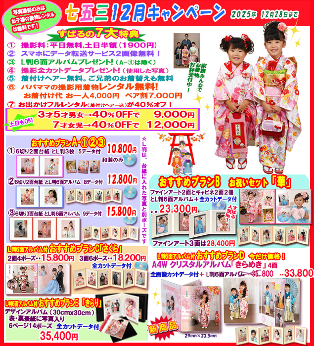 | 素敵な笑顔を未来に・・ 成人写真の予約受付中! 七五三後撮りキャンペーン実施中! ★初宮参り,七五三のロケーション撮影 ご予約受付中!(大人気) 何処よりもお得で最高の写真を目指して20年! 当店はお客様の待ち時間ゼロ、完全貸切制です。 各種証明写真もお任せ下さい オーデション等もお任せ下さい。是非 ご検討下さ。 |