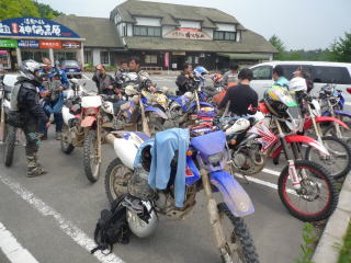 前日と同様、さくっと氷ノ山の西側を走り、途中からTY林道に入ります。ここはF岡さんに先頭を走ってもらいます。う〜んスムーズ。特に下り。うしさんは今日は元気が無い。ちょっと前日飛ばしすぎましたか?TBIに出て一皮むけた走りのうしさんです。ゲーロ君は林道、阪下用にCRF450を購入。WR250Fとは違う走りを楽しんでいます。聖ちゃんも意外と(失礼!)離れず走ってきています。(聖ちゃんが追いつくと、走りだしちゃうので、ほとんど休憩無しになってしまいましたが(^_^;)) ぶぶちゃんとふうさんの走りっぷりにIKEさん、とくさんは驚きの様子です。
