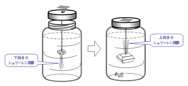 数日すると,結晶のキズが自然に修復され,キラッと光る大きな結晶面が見られるようになる。 観察は,1週間から1ケ月ほど続ける。 「砂糖液が熱いうちは,種結晶の下面から底へ向かうすじ模様が見える。これは,種結晶が溶けて,まわりより少し密度が大きくなった(濃くなった)砂糖液が光の屈折率の違いによって見える筋である(シュリーレン現象)。しばらくすると氷砂糖から上に登るすじ模様に代わる。これは,温度が下がって結晶の成長が始まり,結晶のまわりの密度が小さくなった砂糖液が浮き上がるためである。この上向きのすじ模様は,結晶の成長が止るまで常時観察でき,吊るした種結晶が主に下の方向へ成長することを理解できる。 シュリーレン現象は部分的な密度差が光の屈折率の違いとなって見える現象である。砂糖液が濃い(粘度が高い)ので液が混ざりにくく,密度差ができるとその状態が維持されます。この現象を観察できるのは,砂糖の結晶作りゆえのものである。