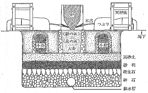 上の図は江戸時代の代表的な「高殿たたら」の地下構造の断面図です。湿気を防ぎ品質の良い鉄を作るのに、いかに苦心したかうかがい知れます。