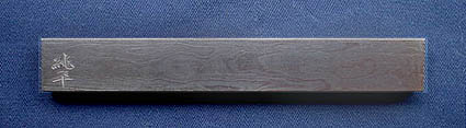 作品はこの様な桐箱に入れてお届けします。この文鎮は品質の良い地鉄を使い、鍛練の後「打ちまくり」といわれる一種の造り込みを行っています。表面は板目の鍛え肌、裏面は柾目の鍛え肌が浮き立って見えます。自然に表れる木目のような地模様には同じ物は2つと無く、いつまでも見飽きない鉄味の魅力が有ります。おおまかな寸法は 縦2センチ 横15センチ 厚み9ミリ前後です。