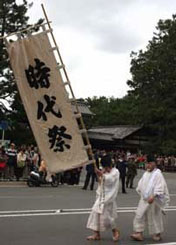| 明治28年、遷都1100年に沸く京都で「第四回内国勧業博覧会」が開催されました。この時、京都はパビリオンとして平安宮大極殿(だいごくでん)の5分の3の模型を建てましたが、その素晴らしさが評判となり、博覧会終了後も『残してほしい』という保存運動が起きました。そこで、この模型の大極殿をそのまま神社として残す事となり、『平安神宮』が誕生いたしました。神社が誕生しますと祭礼(祭り)が必要となります。そこで多くの市民が、この新しい神社のための祭発足に参加し、一大時代仮装行列が考案され『時代祭』が生まれました。古くから都であった京都では、古時代の衣装も多く残っておりましたので、短期間で各時代の装束を揃える事も可能でした。そして、遷都1100年にちなんで、桓武天皇が長岡京から遷都されてきたと伝えられている10月22日が祭礼日に決まりました。なお、桓武天皇の平安遷都は延暦13年(794)で、正確には明治28年は遷都1101年になります。祭礼の行列は、この時から、平安時代から明治維新までの装束に扮するものと決められ、当初、6行列が古い時代から順に巡行しておりましたが、大正時代に入り、『明治維新から平安時代へと時を遡ってパレード』するという、当時では、人々を驚かせる発想の転換を経て、現在では18行列がパレードしています。 |