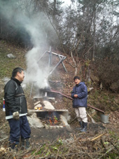 | 山での伐採作業で椎茸の原木・薪・木酢液用に分け、炭作り(右上)宝島では炭は副産物で木酢液を採るために炭を焼きます。木酢液は宝島の野菜作りに欠かせない物となっています。養分の吸収を促進させたり、土壌活性に、またタカノツメなどを漬け防虫効果を高めるなどと其の他にも 作物への効能が、いろいろと有るようです。 下の作業は、冬の間、宝島キャンプ場(自称)の整備、果樹の棚・自生する植物(ささゆり等)の保護(猪から)柵作り |