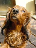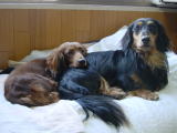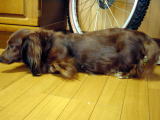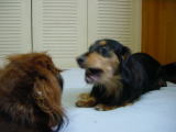 最近ダンクは、少し不機嫌。チョコが全く遊びの相手をしてくれないから。代わりに私たちが遊び相手になっても、すぐにチョコの方へ突進。オモチャをチョコの鼻先へ持っていき、「フンガッ、フンガッ」と振り回して誘っている。でもチョコは知らん振り、自分のペースでボール遊びをしている。たまらずダンクが一声で鳴くと、「ガアゥ〜!!」とチョコに一喝される始末。可哀想.なダンク。 |
