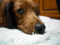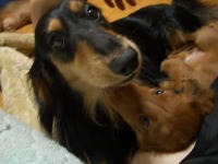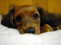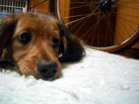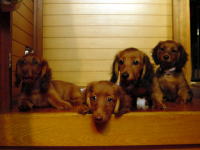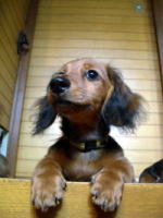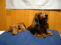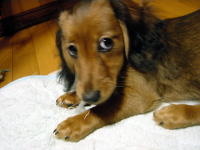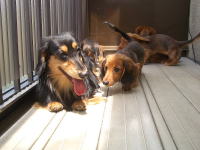 | 2004.07.13(生後103日目)→ ココアは「遠吠え」が得意。 階段の一番上から、 1階の人の気配を感じると、 しばらく吠え、「遠吠え」します。 チョコとダンクは今まで1度も したことがなかったので、 初めて聞いたときは、 「これが、遠吠えかぁ〜」と 感心してしまいました。 |