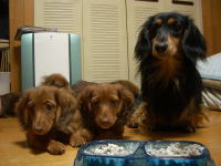 ←2004.06.26(生後86日目) えさの前で「マテ」の練習です。 子どもたちに紛れてダンクも! やっぱりダンクは上手いね! ちゃんと「マテ」が出来てます。 カルアとシュートも何とか 持ちこたえてるかな?? |