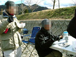 関西スピナーマスターズ オフ♪ 第3回スピナー王選手権! In 小柿谷渓流釣り場 with うどん 【参加者: wogeyさん タニハラさん ごるご十三さん マサルさん かわむらさん ウィンチェスター・モリタさん ああるさん とも 計8人】 【ルール: 制限時間内で回転系ルアーで釣った魚(魚種問わず)の全匹長寸で競争】 やってまいりました第3回スピナー王選手権♪ 前回 2004 10/31 に行われた 第2回は 青野ダム この年数回の恒例の催し物に現2代目スピナー王として参加してきました。 今回は第1回と同じでトラウトってことなんだけど初めてだしさっぱりワカラン。 取りあえず回転系ルアーのスピナー(前回の賞品で頂いた物)他なんだかよくわからん物を持って行った。 タックルはバス用のMLのスピニングロッドにリール(これも前回の賞品)に 8lb のナイロンライン(汗) こんなんで エエンカ? でもこれしかないっすぅ〜♪ 皆は UL のベロンベロンのロッドに 3lb ぐらいのラインらしいっすぅ〜 でああるサンを待ってる訳なんだけど一向に来る気配がないのよね・・・・ 連絡すると何回かお越し下さってるのになんでも道に迷ってるとか? 道具は全部道端にだしてるしぃ〜 寒いけどクーラーボックスの上に座ってコーシーでも飲んで待ってようかね♪ 現地につくと既に到着してる方々が場所取りに行く所に遭遇。 ご苦労様っす!(`-´ )ゞ オイラ達も \3500 を払ってキップを購入してああるサン・かわむらサンとトイレに移動。 そして釣り場へ移動 寒いから防寒用にウェーダ−を着込む。 これで完璧! でも後で辛いハメに合う。 んで荷物を持って釣り場に行くと既に釣りをしてるご一行様。 辺りはまだ真っ暗で霜が降りる位寒い。 後で調べると気温は−3℃ そら無茶でっせ!( ̄○ ̄;) とにかくさっぱりわからんもんで明るくなるまで適当に遊ぶ。 明るくなる前にマサルさんが釣れてるんだよなぁ〜 魚はなに? ブラウントラウト? なんだかわからないけど羨ましいっすぅ〜♪ 明るくなって wogeyさんの挨拶 を有り難く頂戴。 今回マサルさんとは初対面。風貌からしてかなりの 釣りウマっを感じました。