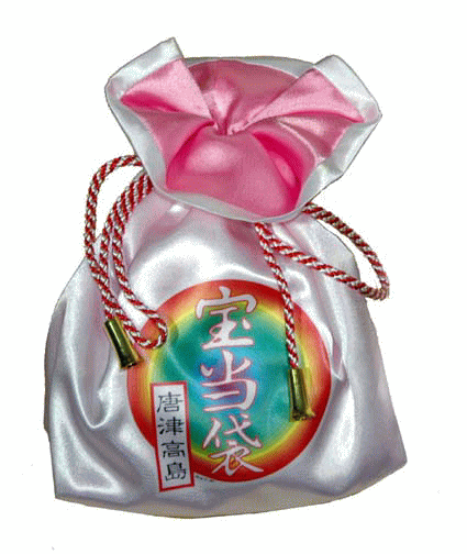 毎回、300枚以上ご注文のお客様 には左記の宝当乃館の伝説のニュー 宝当袋「輝き2000」を宝くじ保管用 として、お送りさせて頂いております。 このニュー宝当袋「輝き2000」は、数年 前ご主人、奥様、別々にグループ買い されお2人合わせて「3億5000万円」 当選されと言う大変、縁起の良いもの です。お2人に習い大切な宝くじを入れ 抽選日をたのしみにお待ちください。 全国推奨観光土産品にも 認定を受けています! |
