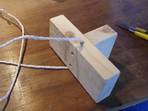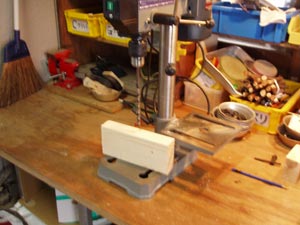 | ヒモも下駄の歯もちょうど真ん中になくてはいけないので、穴を合わせなければならない。ハンドドリルではちょっと厄介なので、ボール盤でヒモを通す穴とネジを打つ穴を開ける。 やはり道具は有り難い。 |
