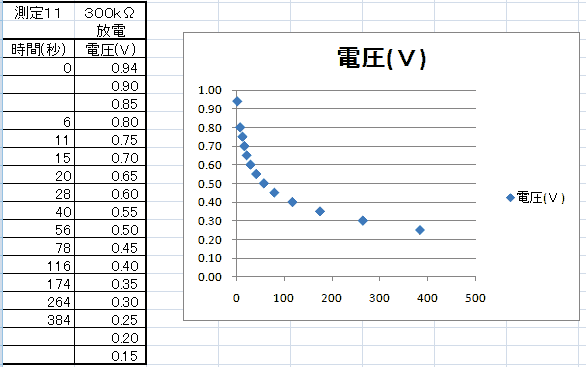 放電特性。 測定8は自然放電。 測定9は100kΩで放電。 測定10は210kΩで放電。 測定11は300kΩで放電。 自然放電がかなり大きいことが分かる。 測定10と11の重なり方がおかしい。どちらかが失敗か。 |